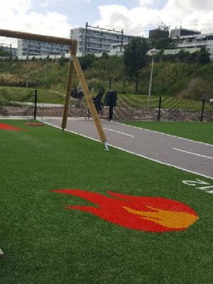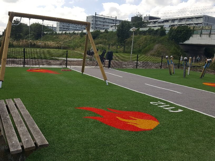 'De ondergrond van de speelplaats is geheel opgebouwd uit kunstgras in diverse kleuren die gras, wegen en vlammen verbeelden. Het ziet er flitsend uit', vindt Paul Wervenbos, projectleider bij Verheij. 'Er zijn ook verschillende brandweerelementen geplaatst. Kinderen kunnen springen in een valnet, meerijden met de brandweerwagen en glijden als een brandweerman. Het is een van de leukste speelprojecten die ik in Zuidplas heb mogen doen.'