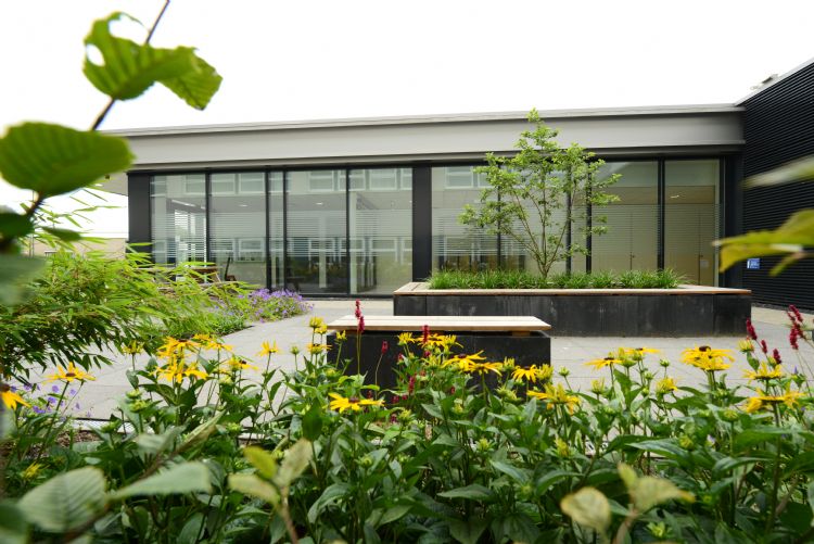 Om de aanblik van het nieuwe gebouw zo rustig mogelijk te houden, is ervoor gekozen om de vorm van de dakrand terug te laten komen door middel van een lage blokhaag. Vanuit het gebouw heb je zoveel mogelijk zicht op de waterpartij voor het gebouw. Hiermee ontstaat een mooie verbinding tussen binnen en buiten. Het voordeel van een prairieborder is dat deze weinig onderhoud nodig heeft, waardoor de onderhoudskosten laag gehouden kunnen worden.