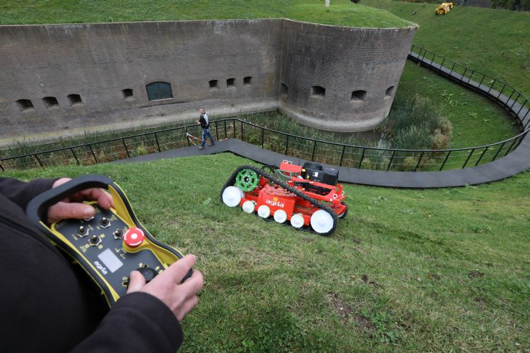 De Agria-taludmaaier is makkelijk te bedienen met de afstandsbediening. Tot 300 meter is hij nauwkeurig aan te sturen. Anne Hekman: 'Daardoor kun je als bestuurder op een veilige positie gaan staan. Je kunt de Agria 9600 ook inzetten op plekken waar je met de bosmaaier niet kunt komen, zoals achter de vangrails. Normaal gesproken moet je daarvoor toestemming vragen voor wegafzetting en een wegafzetting regelen. Nu laat je de taludmaaier erheen rijden, terwijl je als bestuurder op een afstandje staat.'