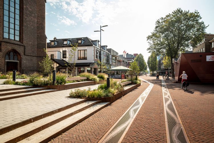 Naast de esthetische toevoeging zorgen de ExoDrain lijngoten van ACO met de custom made CorTen-stalen roosters voor de klimaatbestendige regenwaterafkoppeling in de winkelstraat. Zo wordt het hemelwater niet meer direct geloosd op het riool maar opgevangen en naar de Hengelose beken geleid.