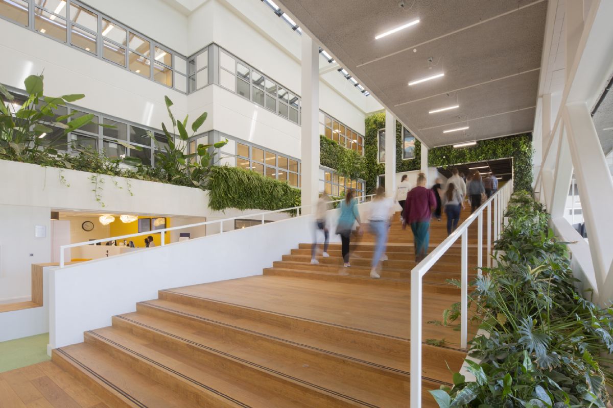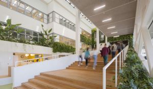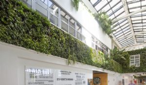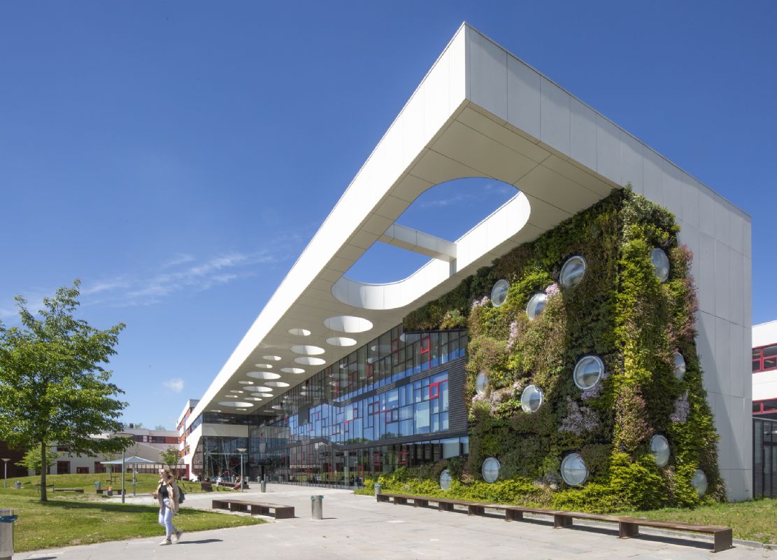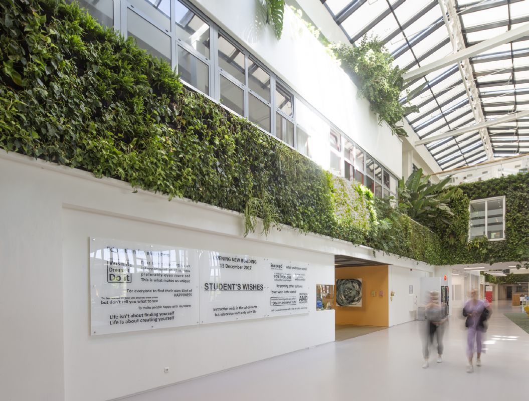 De indrukwekkende schoolgebouwen van de NHL Stenden Hogeschool zijn de afgelopen jaren intensief vergroend. Donker verzorgde met dochteronderneming Green Fortune zowel binnen als buiten spectaculaire groene gevels en wanden. Kanters: ‘Uitgangspunt bij het ontwerp was het creëren van een gezonde groene studieomgeving voor de studenten en leraren, want groen is gezond en heeft een positieve invloed op de concentratie, sociale omgang, luchtzuivering, stressvermindering en daarmee de algehele gezondheid.