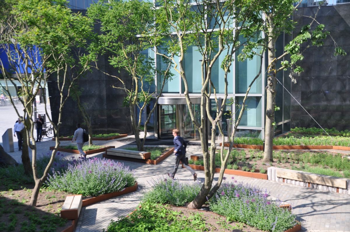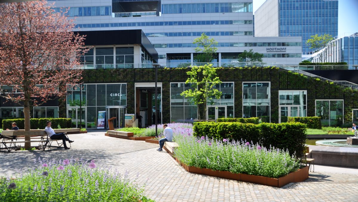 ‘Opdrachtgever ABN Amro wilde een “circulaire daktuin” voor zijn circulaire paviljoen genaamd Circl, dat op de Zuidas naast het hoofdkantoor ligt. Het resultaat is een veelhoekig ontwerp, dat de natuurkracht symboliseert die haar oorspronkelijke plaats weer inneemt in de stenige Zuidas. De tuin is zo ontworpen dat de medewerkers er kunnen verblijven, maar ook werken. Zo is er veel aandacht geschonken aan diverse plekken: bankjes van inlands hout, grappig hergebruikte tegels voor zitplaatsen om te lunchen, maar ook vergadertafels en statafels. We zitten immers al veel te veel. Lange beplantingslijnen verbinden het hoofdkantoor met het paviljoen en zijn groene gevels. De plantenborders zijn verhoogd en opgesloten met cortenstaal, scharnierbaar voor hergebruik.