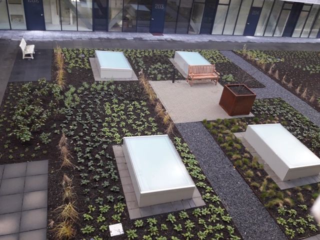 De passage heeft een minimale opbouw met een constructie van maximaal 7 centimeter, een uitdaging om dat voor elkaar te krijgen. De Enk heeft hier Schellevis-tegels van 80 x 80 en 5 centimeter dikte gelegd met een tegeltiller. De uitlijning is in samenspraak met de architect gedaan. Ook bij het realiseren van de binnentuin was het een uitdaging om efficiënt om te gaan met de beperkte ruimte en dakbelasting. Het dak is ingedeeld in drie verschillende belastingklassen. Dat is te zien aan de verschillende opbouwhoogtes. De Enk legde in dit deel tegels op tegeldragers, plaatste cortenstalen verhoogde bakken, verharde de wandelpaden met split en maakte terrassen en een vlonder met pergola. Het resultaat is een gevarieerde daktuin met verschillende materialen.