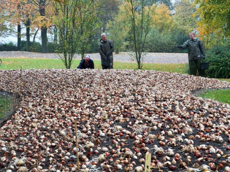 Op 13 november loop ik met voorman Stefan Slobbe door het park. Overal zitten planters geknield in de bedden. Ze steken hun platte troffel loodrecht in de grond, om er handmatig en vakkundig - steeds vier vingers uit elkaar - vooral tulpen te planten; een indrukwekkend gezicht. Onze nieuwe JUB-borders (de tuinlieden noemen ze de 'ribbels', omdat ze verhoogd zijn) liggen er nu nog maagdelijk bij, maar vanaf a.s. maandag zullen hier meer dan 20.000 bollen worden aangeplant, respectievelijk 46 en 48 verschillende soorten per border. Een deel van de bollen is dit jaar biologisch geteeld.