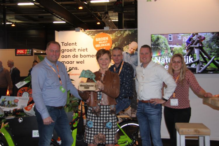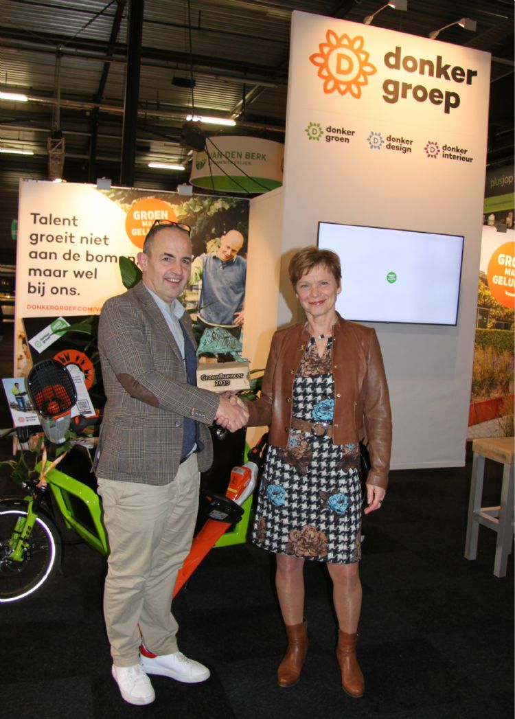 We zijn er uit. Vandaag, op de laatste dag van de Groene Sector Vakbeurs, werd de Greenfluencer 2019 gekroond. Anja Kanters, algemeen directeur van Donker Groep, ging er met de eer vandoor. "Trots op deze prijs", zegt Kanters als ze de bladvormige Greenfluencer-trofee in ontvangst neemt. Landschapsarchitect Nico Tillie (TU Delft) deed de beste groene belofte voor 2020.