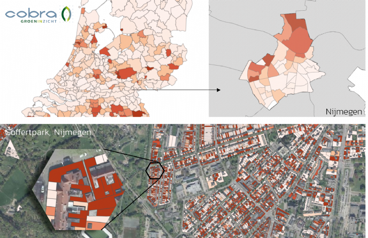 Alle gemeenten die bij Operatie Steenbreek zijn aangesloten, krijgen toegang tot deze kaart. Je kunt hierop zien wat de gemiddelde verstening van tuinen in een buurt, wijk en gemeente is. Om de verstening te berekenen en in kaart te brengen, maakte Cobra gebruik van satellietbeelden en luchtfoto's.
