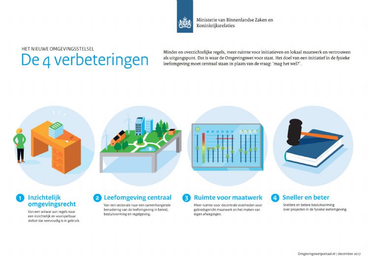 ActualiteitDe Omgevingswet is een bijzonder actueel thema. Tijdens de studiemiddag was nog steeds niet helemaal zeker of de Omgevingswet op 1 januari 2021 in werking treedt. Later op de avond heeft de Eerste Kamer echter ingestemd met de Invoeringswet Omgevingswet, waardoor de Omgevingswet op 1 januari aanstaande daadwerkelijk in werking moet treden. Hierbij geldt overigens nog wel de voorwaarde dat de wetgeving en het Digitaal stelsel Omgevingswet (DSO) afdoende zijn geïmplementeerd bij alle overheden.Aanleiding studiemiddagDe studiemiddag werd afgetrapt door Elske Oost van OBB, waarbij zij uitleg gaf over de vraag waarom deze studiemiddag werd gehouden.De Omgevingswet lijkt op het eerste gezicht namelijk mooie verbeteringen te bieden ten opzichte van de huidige wetgeving voor het ruimtelijk domein. De vier verbeteringen worden weergegeven in figuur 1. De Omgevingswet moet ervoor zorgen dat het omgevingsrecht (weer) overzichtelijk en begrijpelijk wordt - minder regels en meer kansen, doordat er meer ruimte komt voor maatwerk. Ondanks al deze verbeteringen bleef de vraag overeind welke effecten dit zou hebben op onder andere kinderen en speelruimte(beleid). Een zoektocht op een website zoals www.aandeslagmetdeomgevingswet.nl geeft geen enkel relevant resultaat met betrekking tot kinderen. Ook in reeds bestaande omgevingsvisies blijken kinderen en speelruimte over het algemeen niet of nauwelijks aan de orde te komen. Dat is vreemd, omdat zo'n 20 procent van de bevolking kind is. Het lijkt erop dat we een groot deel van de bevolking onbewust negeren. Om te voorkomen dat we de kinderen met het badwater van het omgevingsrecht weggooien, werd de studiemiddag Omgevingswet en Spelen georganiseerd.