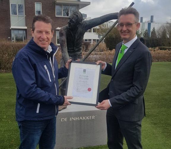 Genoeg reden voor Groenkeur-directeur Dick Oosthoek om langs te gaan om kennis te maken en de Groenkeur-oorkonde te overhandigen. Dat gebeurde voor het beeldje van de Inhakker in Nieuw-Vennep. Vader Griekspoor begon het bedrijf immers met het maaien en leeghalen van slootkanten. Een intensief karwei, waarbij je algauw nadenkt over manieren om het jezelf wat gemakkelijker te maken. Om die reden werd een eigen machine ontwikkeld. Dit typeert het bedrijf: 'U vraagt en wij draaien, maar we proberen het wel slim te doen.'