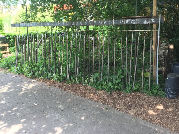'We rekenen op een oppervlak van zo'n 10 m² per kind', vertelt Hotting. 'Een deel daarvan is pad, een ander deel borders met andere planten. De rest, een 7 m² (2 bij 3,5 m), heeft elk kind aan échte tuin. Die tuintjes (plotjes) zijn weer verdeeld in twee bedden.' De afmetingen zijn gebaseerd op de postuurtjes van de kinderen. 'Een bedje van 80 cm breed kunnen ze, als ze van twee kanten werken, precies met hun harkjes bereiken', vertelt Hotting. 'Het is de bedoeling dat de kinderen twee à drie weken nadat ze in april begonnen zijn al hun eerste gewassen kunnen oogsten.' Er wordt zo gezaaid dat er vanaf dat moment elke week iets uit de tuin te plukken is. 'Dat is een stimulans voor de kinderen om het werk in de moestuintjes te doen', legt Hotting uit. Op de plekken die na de oogst vrijkomen, worden gewassen geplant die tijdens de zomervakantie kunnen groeien. 'Dan zijn de kinderen er natuurlijk niet, dus dan moet er ook eigenlijk niets te oogsten zijn. Maar als ze weer terugkomen, is het zaak dat er snel wel weer iets te plukken is.' Als kers op de taart wordt de oogst ook samen met de kinderen verwerkt. 'Van salades en pizza's tot zalf van Calendula (goudsbloem), sambal, kruidenazijn en natuurlijk een mooi boeket of bloemstuk. Zo gaat het het hele jaar door.'