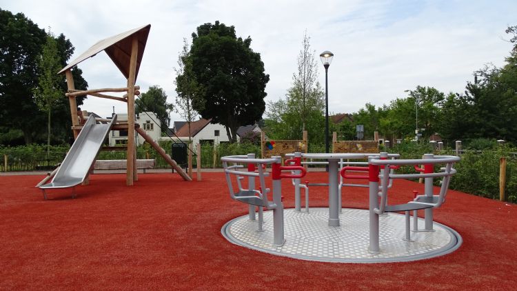 De speeltoestellen zijn vooral afkomstig uit het Adventure Play-assortiment. Daarnaast zijn er in het ontwerp speciaal ontworpen toestellen meegenomen, zoals een draaicarrousel, om kinderen met een beperking ook een fijne en veilige speelplek te bieden. 'Daar kan een rolstoel in vastgemaakt worden, zodat ook die kinderen lekker kunnen draaien. Bij een beperking moet je overigens niet altijd denken aan kinderen in een rolstoel; het is hier ook geschikt voor kinderen met ADHD, ADD of andere gedragsstoornissen. Als ze even een momentje alleen willen zijn tijdens de drukte van het spelen, kunnen ze zich afzonderen. Ook de vogelnestschommel is geschikt voor kinderen met een fysieke beperking', aldus Jan Eestermans van de dorpstafel van Moerdijk. De kleur van de fitnesstoestellen is afgestemd op de omgeving. Zo kunnen de vaders en moeders sporten en bewegen, terwijl de kinderen lekker aan het spelen zijn. Geraadpleegde bronnen: BN De Stem