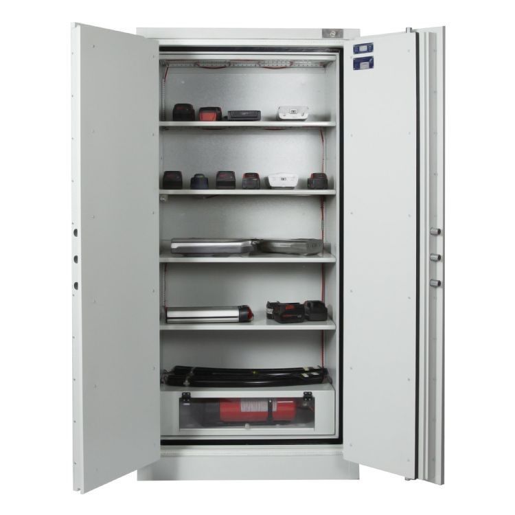 Oplaad-/beveiligingskast voor lithium-ionaccu's blust per accu dankzij compartimenten