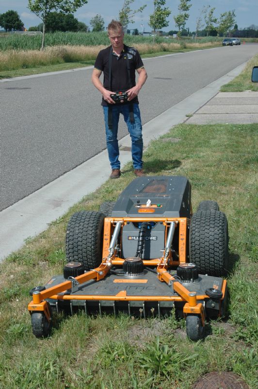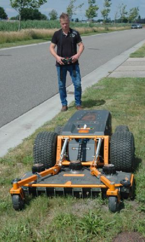 Van der Tol zendt zijn demomachine met de radiografische besturing door de bedrijfshal naar buiten en start de maaier in de grasberm. De elektrische motoren die de drie messen van het maaidek direct aandrijven, beginnen te zoemen. Al heel snel draaien ze hun rondjes met 3.000 rpm. Hij demonstreert ook de veiligheid van het 104 cm brede en 60 kg zware maaidek. Zodra hij de motoren uitzet, staan ze vrijwel meteen stil. Dit is te danken aan een soort elektrische rem. Het maaidek kun je eventueel omvormen tot mulchdek. Daartoe moet je aan de onderkant van het dek enkele platen monteren. In de standaarduitvoering beschikt het dek over een achteruitworp. 'We werken ook al aan dekken van 132 cm', vertelt Van der Tol. 'De Raymo is dus ontworpen als een radiografisch bestuurde werktuigdrager. Zo is er op dit moment ook een soort messenbalk in ontwikkeling waarmee je hogere en ruigere gewassen te lijf kunt, en werkt de fabriek aan een klepelbak.'