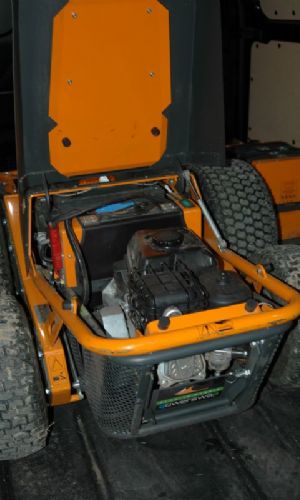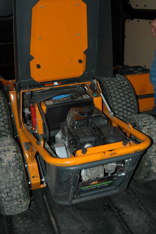 De machine heeft compacte afmetingen, past in een bestelbus en met behulp van de afstandsbediening en rijplaten kan hij snel gelost worden. De ondernemer verontschuldigt zich voor een lelijke kras op deze demo; hij is slechts 51 cm hoog en daarmee de ideale machine om het gras van zonneparken te maaien. 'Tijdens mijn laatste demonstratie op een zonnepark in Zuid-Holland liep hij vast. De zonnepanelen waren in werkelijkheid centimeters lager gemonteerd dan op papier stond.' Van der Tol zal speciaal voor de redactie van Stad + Groen de werking van de machine demonstreren. Zijn demo-Raymo is na de vorige klus geparkeerd in de hybridemodus in de bestelbus. Dat betekent dat er nu een plug-incartridge in de machine zit met een accupakket én een 3,9 pk B&S-benzinegenerator: 'Met deze power swap, zoal ik het noem, kun je twee tot drie uur werken. Dan is het accupakket leeg en start automatisch de motor om het accupakket van elektriciteit te voorzien. Je kunt gewoon doormaaien', zegt Van der Tol. 'Het is echter ook mogelijk om hem als zuivere accumaaier te gebruiken. Daarvoor levert Machines4Green een cartridge-accupakket van 120 Ah. Zo'n plug-incartridge verwissel je binnen een minuut. Dit accupakket, waarop je vier tot vijf uur kunt maaien, maakt de maaier met 240 kg wel iets zwaarder en duurder.'