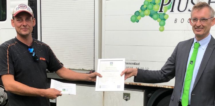 Twee groenwerkers van de Koninklijke Ginkel Groep ontvingen deze week het Groenkeurcertificaat Boomveiligheidcontroleur (BVC). Niet alleen was het duo de eerste die het digitaal examen aflegden - en behaalden - ze ontvingen twee eerste deels uit bermgras gemaakte persoonscertificaten.