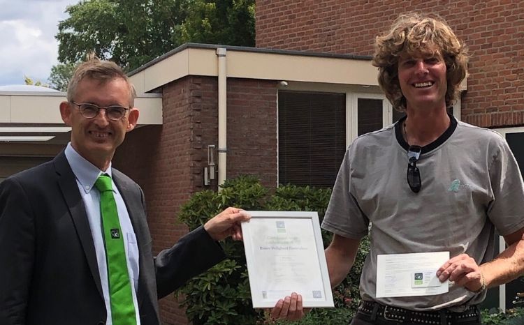 Maandag 3 augustus verraste Groenkeur-directeur Dick Oosthoek Erik Bor en Gjalt Kootstra tijdens hun boomwerkzaamheden. De vakmannen werken voor de Koninklijke Ginkel Groep en hebben het hercertificeringsexamen Boom Veiligheid Controleur (BVC) behaald. Zij waren de eersten die het examen digitaal aflegden. Naast de BVC-pas overhandigde de directeur hen ook de eerste persoonscertificaten die voor een deel uit bermgras bestaat. Het gras is afkomstig van langs de N11 bij Bodegraven.
