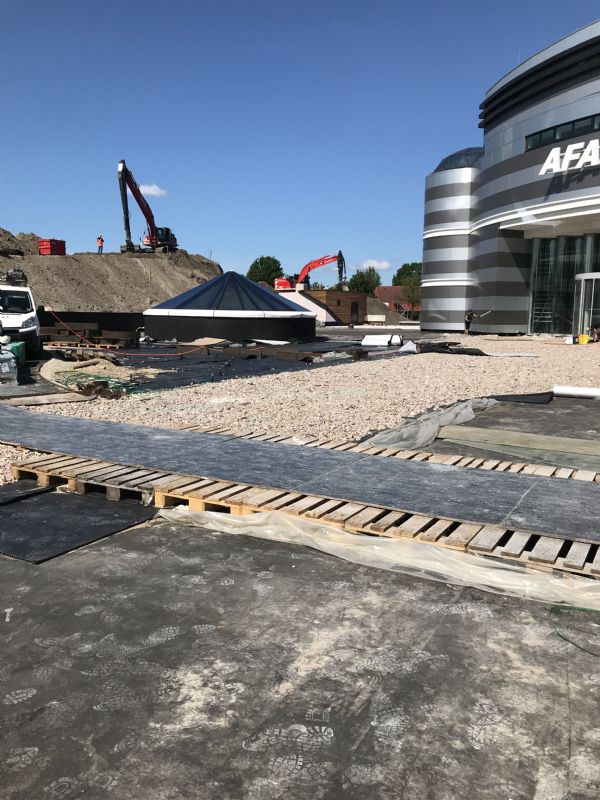 Voor het parkeerdak van het AFAS Experience Center zijn drie verschillende daksystemen uitgekozen. 'Voor de platte daken is gekozen voor het ND 5+1 drainagesysteem, geschikt voor een daktuin met een intensieve of extensieve vegetatie. De hoge druksterkte van dit drainagesysteem zorgt ervoor dat de noppen, ondanks de hoogte (26 mm), dezelfde vorm blijven behouden, waardoor de drainage niet in het gedrang komt. De hoogte van de nop maakt dit drainagesysteem geschikt voor daken zonder afschot (platte daken). Hier is het bedoeld voor de wandeltuin op de dubbele parkeergarage.' Op het dakdeel met licht afschot heeft Wesselink gekozen voor het ND 4+1h drainagesysteem met een nophoogte van 15,5 mm. Dit drainagesysteem met waterreservoir is eveneens bedoeld voor daken met een extensieve of intensieve vegetatie, maar doordat de daktuin op afschot ligt, hoeft de afvoer minder hoog te zijn. Op een deel van het dak van de ondergelegen parkeergarage komt een bovengrondse parkeerplaats. Hier is gekozen voor het berijdbare ND 620hd drainagesysteem. De extreem hoge druksterkte (1200 kPa), het speciale filterweefsel op de bovenkant en de glijfolie aan de onderzijde van de noppen maakt dit drainagesysteem uitermate geschikt voor berijdbare belasting.