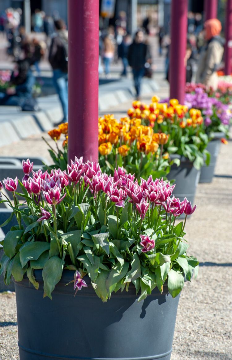 In het voorjaar, als de bomen net uit beginnen te lopen, is het effect van tulpen in de bebouwde omgeving groots. Ze bieden direct kleur, geur én leven in een, tot voor kort, nog stille en grauwe openbare ruimte