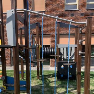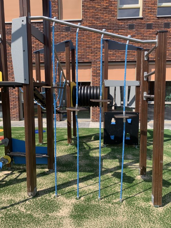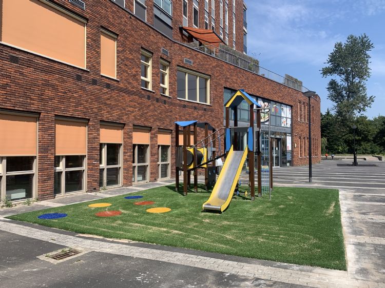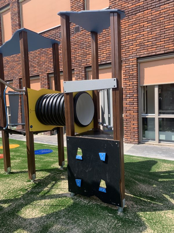 Vlak voor het nieuwe schooljaar is de oude ondergrond en toestel verwijderd. Het cunet is aangepast, het speeltoestel is geplaatst en valdempend kunstgras aangelegd.