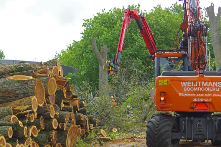 Bij dergelijke rooiprojecten gaat De Brouwer als projectleider altijd eerst op locatie kijken. 'Ik neem daar zelf een kijkje en stel vast welke machines geschikt zijn om de te verwijderen bomen veilig en efficiënt weg te halen', vertelt hij. 'Omdat het aantal aangetaste iepen wekelijks toenam, ben ik voor dit project meerdere keren de stad rond gereden. Dat resulteerde in drie rooilijsten. Op een viewer, een digitale kaart, geef ik aan welke bomen verwijderd moeten worden en welke rooiploeg op welke locatie aan de slag moet.' Waar mogelijk zette Weijtmans vaste ploegen in. 'De ploeg die de boom bovengronds verwijdert, bestaat uit vier medewerkers. Die wordt direct opgevolgd door een stobbenfreesploeg en een ploeg die freesafval ontgraaft en straatzand of teelgrond aanbrengt', licht De Brouwer toe. 'Indien nodig wordt de betreffende boomspiegel in verharding dichtgestraat en de opgedrukte verharding hersteld. Op drukke plaatsen is te allen tijde aanvullende verkeersbegeleiding door één of meerdere verkeersregelaars. In totaal zijn er op de locaties acht tot tien medewerkers werkzaam.'