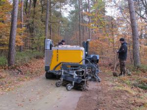 Iverde Bomendienst doet een gps-Klic-melding via een app op de smartphone. 'De RS1000 is vooral geschikt om in te zetten voor wortelschermen langs kilometerslange fietspaden met wortelopdruk', zegt Barhorst. 'Van tevoren maken we een inventarisatie van kabels, leidingen en beworteling. We schatten de situatie in, om zeker te weten dat we tijdens het frezen en het plaatsen van het worteldoek geen stabiliteitswortels van omliggende bomen raken. De frees graaft 65 cm diep. Het wortelscherm steekt daar enkele centimeters bovenuit, anders kunnen de wortels er alsnog overheen groeien. De machine stampt de grond na de plaatsing netjes aan. In één werkgang wordt de hele operatie voltrokken. Alleen voor het wisselen van een wortelschermrol of bij ondergrondse obstakels of bovengrondse kruisingen houden we halt.'