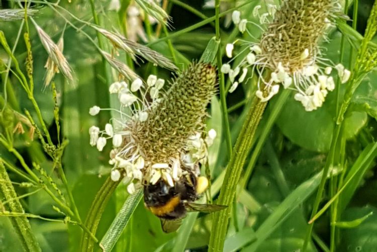 We hebben uitgezocht welke insecten er op de toegevoegde soorten afkomen. Voor de smalle weegbree zijn dat wilde solitaire bijen, zandbijen en gewone geurproefbijen en de witte klaver krijgt belangstelling van de donkere klaverzandbij, rode zandbij, geelgespoorde houtmetselbij, klaverdikpootbij en vroege bloedbij. De smalle weegbree is daarnaast een waardplant voor vlinders net zoals de witte klaver, die ook een nectarplant is voor vlinders. Beide soorten zijn inheems en bestand tegen betreding en maaien. Ook zijn ze beide diepwortelend. Dit is belangrijk voor het kunnen bereiken van het vocht dat dieper zit in tijden van droogte. En omdat er door de beworteling ondergrondse infiltratiekanaaltjes ontstaan, kunnen deze tijdens zware buien ervoor zorgen dat het water sneller afgevoerd wordt, de grond in. Het mengsel gaat zelf efficiënt om met water. Er zitten extensievere soorten in die, als ze eenmaal gevestigd zijn, minimale vochtbehoefte hebben en in tijden van droogte en hitte tegen een stootje kunnen.'
