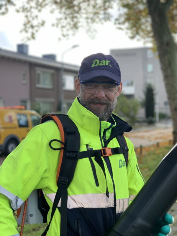 Later vragen we Tommy Nagtegaal van Stihl om een reactie. Hij zegt: 'Het is niet realistisch om op professioneel niveau alles met een hark en een schep op te ruimen. Blad dat massaal valt en nat wordt, kan een ijsbaan worden. Gaat het lokaal om kleinere hoeveelheden, dan kun je de hark pakken of het laten liggen. Maar blad moet toch worden opgeruimd, zeker als de verkeersveiligheid in het geding komt. Wij horen en zien wat de maatschappij vraagt en blijven investeren in duurzamere technieken. We horen de roep van gemeenten, groenvoorzieners en inwoners om stillere én krachtige bladblazers. Daarom hebben wij deze nieuwe Stihl BGA 200 op de markt gebracht. Wij hebben hierbij bewust voor een losse blazer gekozen, die zowel los in de hand gebruikt kan worden als in de holster. In dat geval heb je het comfort van een ruggedragen bladblazer, dus minder tegendruk, minder belasting voor je arm. De belangrijkste reden om te kiezen voor een losse blazer is de kracht. Bij een ruggedragen bladblazer is er debietverlies door de blaasinrichting vanaf de motor. Bij de BGA 200 bieden wij het beste van twee werelden: het comfort en de kracht van een ruggedragen bladblazer, de ergonomie en flexibiliteit van een handgedragen bladblazer. Bijna tegelijkertijd hebben we onze nieuwe ruggedragen accu gelanceerd: de AR 3000L. Deze heeft een enorme energie-inhoud, waarmee je een dag uit de voeten kunt.' Dit beaamt Patrick Blijderveen van Dar: 'We hebben nog nooit gehad dat iemand met een lege accu stond.'