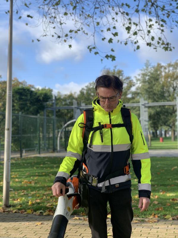 Ook Van Elsacker is zeer te spreken over de kracht van de bladblazer: 'Qua kracht mis je weinig. Het grote voordeel is natuurlijk het geluid. Je hoeft niet de hele dag in een oorverdovend monotoon geluid te werken.' Patrick Blijderveen, teamleider facilitaire zaken, is blij met de nieuwe machines. 'We hebben duurzaamheid hoog in het vaandel staan en geloven dat elektrisch de toekomst heeft. Daarin willen we dan ook graag schakelen. Onze ambitie is om waar mogelijk elektrisch te gaan werken. Sinds vorig jaar zijn al onze groenploegen uitgerust met accugereedschap, waaronder de Stihl BGA 100, waarbij we voor enkele werkzaamheden wat kracht misten. Bij de BGA 200 hoor je niemand meer over het gemis aan kracht. Verder is de grote winst voor ons dat we niet meer 15 à 16 euro kwijt zijn aan brandstof voor een hele dag werken, zoals bij de benzinebladblazer. Dat is veel; er ging wel een pallet brandstof per week doorheen.'
