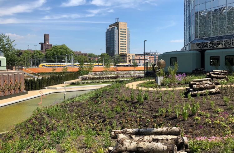 De circa 6500 medewerkers van het hoofdkantoor van de Rabobank in Utrecht kunnen sinds deze zomer buiten ontspannen en zelfs werken in een eigen park, dat is ingericht op het dak van de parkeergarage en in de ernaast gelegen buitenruimte. Ook die bestond voorheen hoofdzakelijk uit een stenen vlakte. De Enk Groen en Golf realiseerde op het geheel een ontwerp van Lodewijk Baljon landschapsarchitecten, samen met daktuinspecialist Zinco en maakte hierbij gebruik van daktuinsubstraat, teelaarde RAG en vijversubstraat van Heicom. Ongeveer de helft van de tuin ligt op het dak van de parkeergarage, inclusief een flinke vijver. Na wat bouwkundige aanpassingen en het leggen van nieuwe dakbedekking kon het groene gedeelte van het project beginnen. Onder het motto 'een eetbare tuin voor mens en dier' werden fruitbomen geplant, waaraan het personeel zich tegoed kan doen, terwijl het bloemengedeelte de fauna moet voeden. De daktuin levert de helft van het oppervlak en is zo aangelegd dat hij met het parkgedeelte naast de garage één geheel vormt.