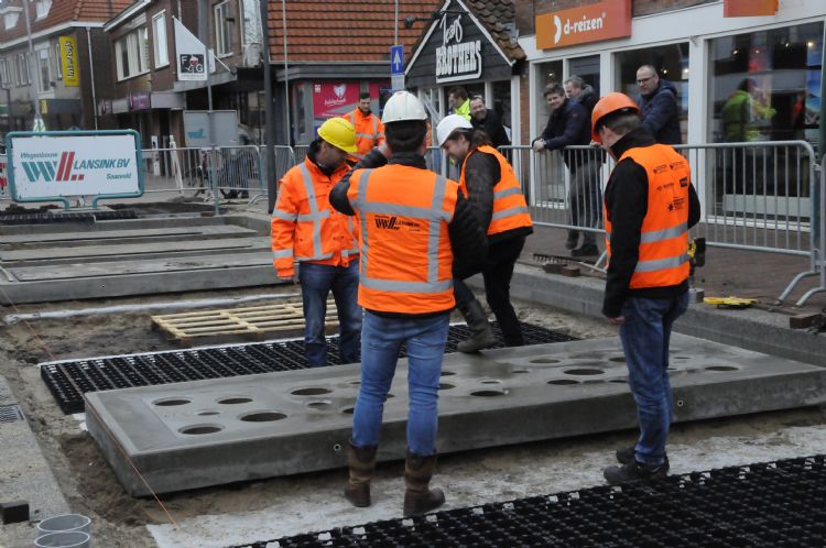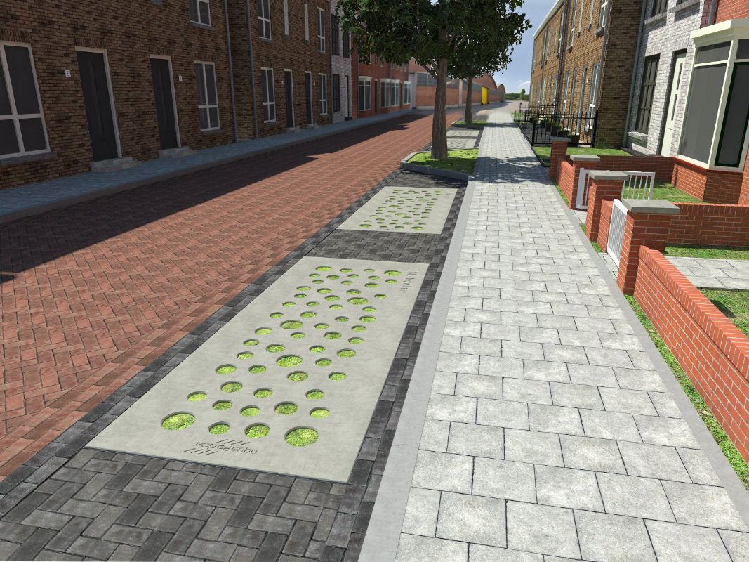 Als het regent, moet zoveel mogelijk van dat kostbare water zo snel mogelijk de ondergrond in. Dat is beter voor iedereen. Beter voor de natuur, beter voor de stad en beter voor de mensen in de stad. Een mogelijke oplossing is dan de ouderwetse grasbetonsteen, maar de laatste jaren is er een aantal producten op de markt gekomen met een wat chiquere uitstraling. Wij laten er twee de revue passeren: Rainaway van ontwerper Fien Dekker, en Aquaparker, die is ontwikkeld door een aantal partijen: Iljitsj IJsebrands van Advirens, Jeroen Koop van D&B Betonproductie, Arjan Woestenenk van Anacon-Infra en Rob van Asperen van Morssinkhof Infra.