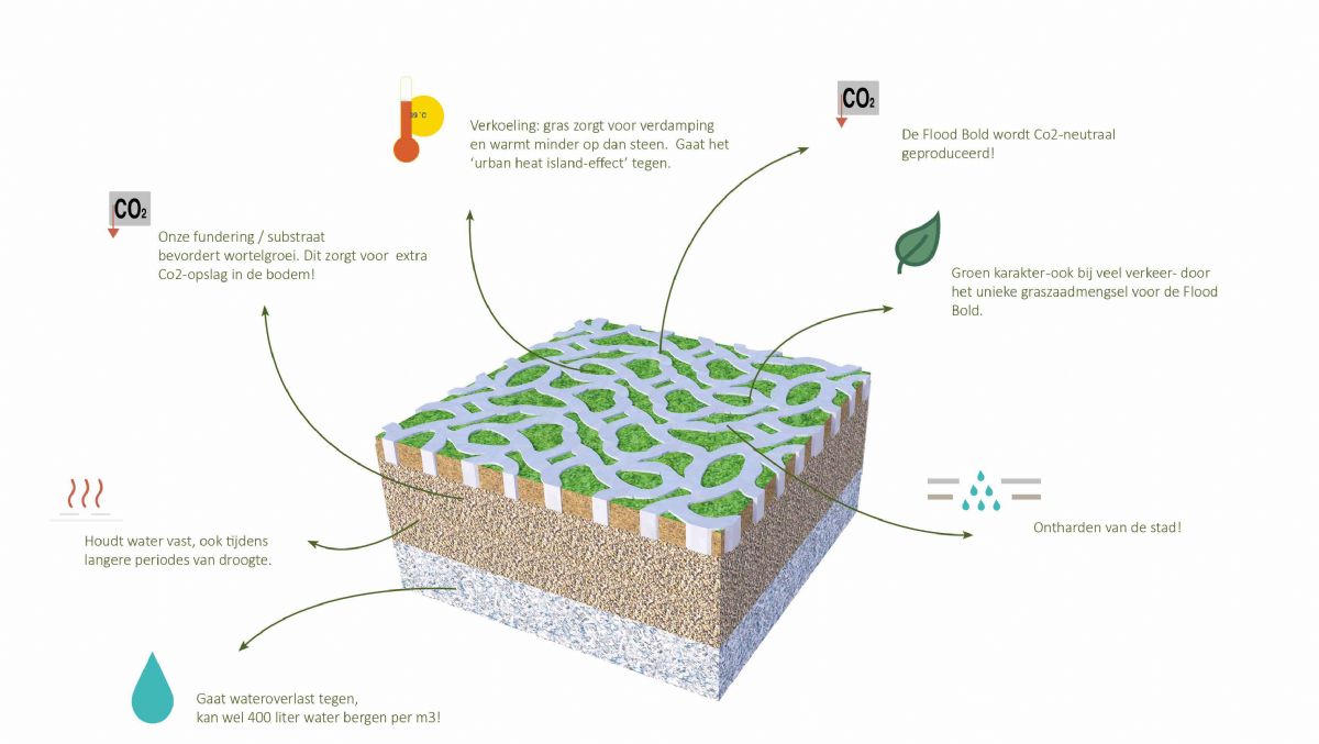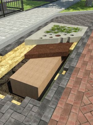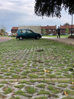 Fien Dekker: 'In de ondergrond hebben we een substraat toegepast met 40 procent poriënvolume. Wij zijn in het algemeen geen voorstander van het toepassen van kratjes. Kratjes hebben weliswaar een enorme capaciteit als het om waterberging gaat, maar zorgen ook voor een capillaire breuk. Het gras dat tussen de Rainaway-tegels groeit, kan dan niet beschikken over het water in de ondergrond. Als we kratjes gebruiken, is dat op een grotere diepte.' Rainaway werkt voor dit concept samen met substraatleverancier BVB Substrates. Die levert het substraat direct onder de tegels, maar ook het rijkere substraat waarmee de tegels zijn ingevuld. Dit substraat heeft een hoger organischestofgehalte en is al doorgemengd met een bijzondere mix van grassen van DSV. Dekker: 'Vraag me niet naar de details. Ik ben zelf geen grasdeskundige, maar we hebben natuurlijk wel samengewerkt met experts op dit gebied. De kracht van het grasmengsel is dat het overrijdbaar is en het goed doet in de schaduw. Door de uitlopers in de wortels én de bovengrond zorgt het voor een ijzersterke fundering.'