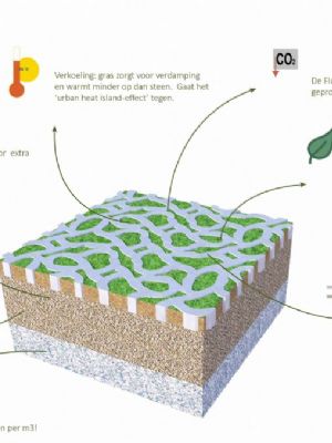 Om met Rainaway te beginnen: dit product is al wat langer op de markt en is ontwikkeld door ontwerper Fien Dekker. Oppervlakkig gezien heeft de steen wel wat weg van de normale grasbetonsteen, maar hij heeft duidelijk een luxere uitstraling. Op de website van Rainaway wordt beschreven dat deze tegel geïnspireerd zou zijn op de Japanse architectuur. Fien Dekker daarover: ‘De vorm is organisch om het geheel een mooi groene uitstraling te geven. Dit geeft een rustig en groen totaalbeeld in plaats van groen in hokjes.’