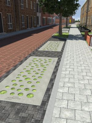 Aquaparker is een principieel ander product dan de Rainaway-tegels. Beide producten – of misschien is ‘concepten’ wel een beter woord – zijn ontwikkeld voor klimaatadaptief parkeren, maar Rainaway is een tegel en Aquaparker een betonnen plaat die is voorzien van gaten. De Aquaparker-betonplaat is 158 bij 400 cm en 20 cm dik. Precies de maat die geschikt is om op te kunnen parkeren. De maat is daarnaast ook afgestemd op de afmetingen van een standaard betonstraatsteen. De gedachte achter Aquaparker is dat de gaten met verschillende diameter die erin zitten enerzijds zorgen dat water snel de ondergrond in kan trekken, maar daarnaast ook gevuld kunnen worden met grassen of kruiden die enige betreding verdragen. Bij zijn uitleg over de pilot filosofeert Iljitsj IJsebrands van Advirens al hardop over soorten als kruiptijm, muizenoor en stekelnootje, maar ook over een breed scala aan vaste planten. Ook zit op iedere hoek van elke plaat nog een extra opening, waardoor water direct de ondergrond in kan trekken.