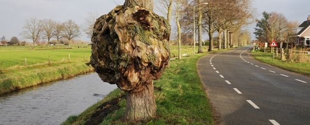 ik heb al een antwoordt gegeven maar bij nader inzien denk ik dat de stam hol is door de schimmel aantasting en dat de boom steeds compensatie groei geeft om overeind te blijven vaak zie je bij kringvormige verdikkingen dat de stam hol is