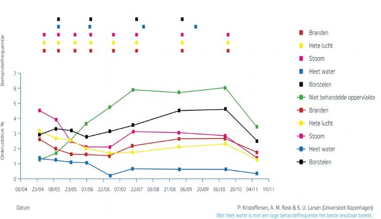 • Hoe vaak moet de behandeling worden herhaald? Onderzoek door de universiteit van Kopenhagen heeft aangetoond dat behandelingen met heet water altijd zorgen voor de laagste onkruidbedekking, zelfs als ze het minst vaak worden herhaald.