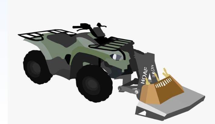 Er is een speciale hef ontwikkeld die de bak verticaal kan tillen; het gewicht van de bak is hier ook op afgestemd. Er zijn dus geen voorloopwielen nodig die over de grond lopen en slijten. Ook kan de gebruiker de bak makkelijk even optillen bij een stoep of bij het op en af rijden van de trailer. De quad kan worden voorzien van een op maat gemaakt gasflessenframe of een tankframe. Optioneel kan de quad nog worden voorzien van een handlans, voor de hoeken waar de bak niet bij kan.