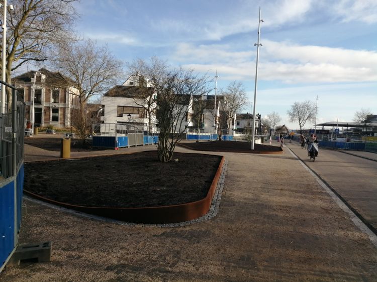 | Stationsplein Zwolle. Met het waterabsorptiesysteem wordt water in de openbare ruimte opgeslagen in een krattensysteem van waterretentieboxen uit 100 procent gerecycled polypropyleen. Dit systeem wordt in Zwolle en Apeldoorn gecombineerd met de aanplant van heesters en planten. |