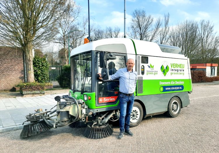| Paul Schouten bij de veegwagen op groen gras (CNG) |