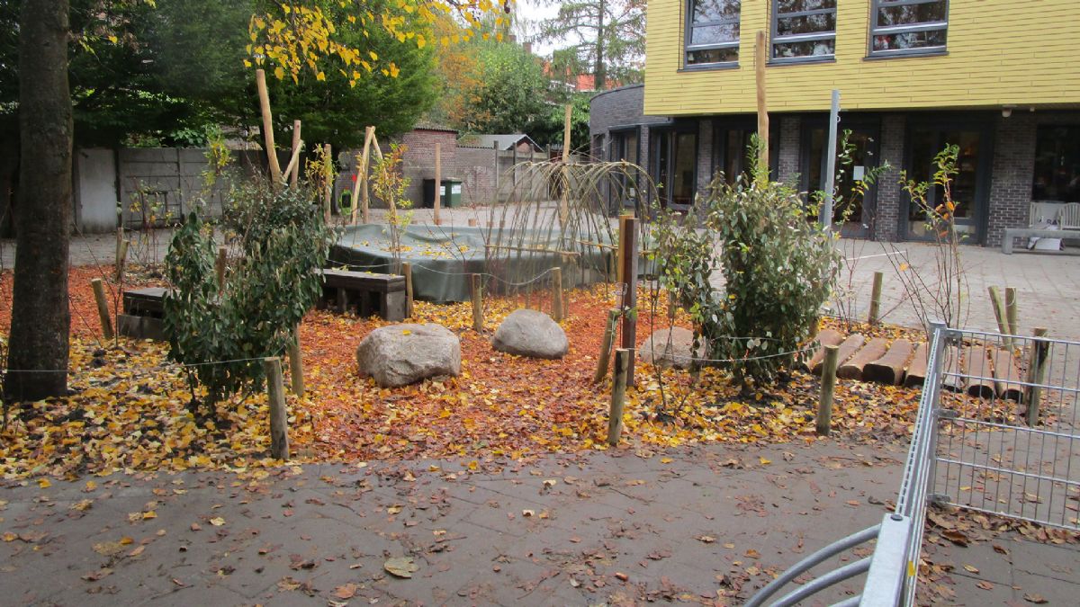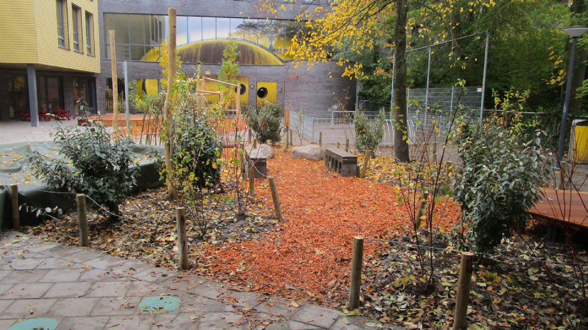 Nadat de wens van een nieuw plein was besproken met de kinderen en het team, kwam al snel naar voren dat iedereen behoefte had aan een natuurlijke omgeving op het schoolplein. Een andere wens was om het probleem van de wateroverlast op te lossen, want na hoosbuien bleef er in het verleden vaak water op het schoolplein staan. Bij de nieuwe inrichting werden veel betontegels verwijderd en stuitte men op een niet drainerende ondergrond. Door het uitgraven hiervan verwacht de projectgroep dat het regenwater voortaan beter zijn weg naar beneden kan vinden. Ook zijn er extra bomen bij geplaatst en is er voor de bestaande bomen ruimte gemaakt, zodat ze beter kunnen groeien en water opnemen. Als extra toevoeging is er een regenton geplaatst op het schoolplein. Het regenwater kan gebruikt worden om planten water te geven én er kan door de kinderen heerlijk gekliederd worden op het plein met zand en water. Ook kan er in de nieuwe moestuin en bloemen-en bijentuin gewerkt worden.