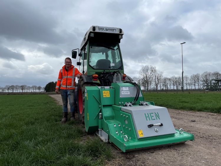 Eigenlijk was het Groningse loonbedrijf Bouwman uit Noordbroek op zoek naar een geschikte maaimachine, maar bij Green Technology Janssen (GTJ) kwam men oog in oog te staan met een bijzondere frees voor halfverharding. Omdat Bouwman ook infrawerken uitvoert, was een afspraak met Jip Janssen van GTJ snel gemaakt. Janssen liet voor Wilmer Stuut, de planner van Bouwman, een demomachine uit Duitsland komen. Stuut: 'Ik heb een proefstuk geregeld bij de gemeente Midden-Groningen. Het ging om een met schelpen halfverhard fietspad. Wij waren verkocht toen we het resultaat zagen en de gemeente was ook tevreden. Nog dezelfde dag hebben we de Hen WPF 100 gekocht. Standaard zetten we hier een smalspoor Fendt 209 voor, want je hebt een wat zwaardere tractor nodig, met een driepuntaanbouw categorie I of II. Aangedreven door de aftakas brengt de machine via een zware haakse tandwielkast de aandrijving over op de freeswals. Deze heeft 65 beitels en maakt ongeveer 250 tpm. De beitels hebben een ronde schacht en hardmetalen widiapunten. Omdat er bij dit werk weleens een steen klem komt te zitten, zit er een dubbele breekboutbeveiliging op, zowel in de aftakas als in de as die de machine aandrijft.'