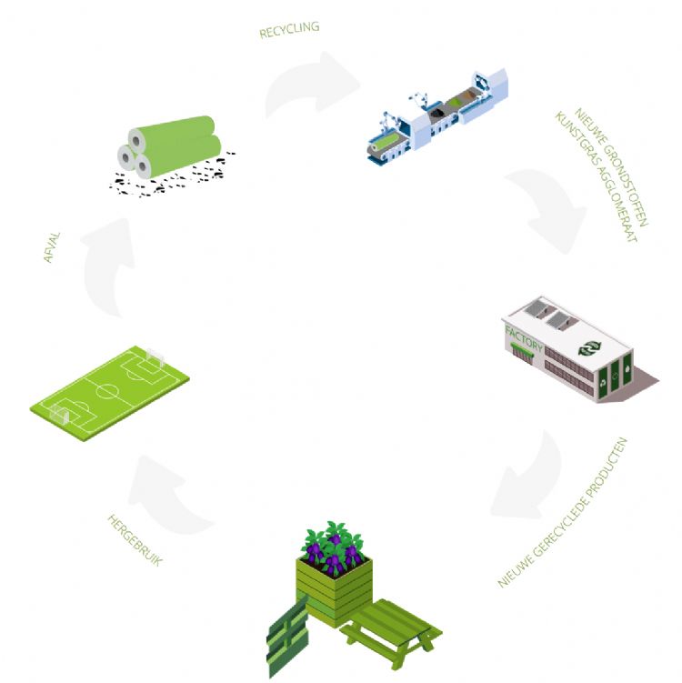 Een product bestaat nooit uit 100 procent gerecycled kunstgras. Afhankelijk van het product varieert het kunstgraspercentage en worden er zaken als uv-additieven of glasvezels toegevoegd om de kwaliteit van het eindproduct te kunnen garanderen.