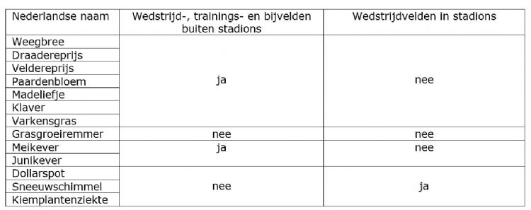Het roer moest om. De kern van de aanpak die vanaf 2013 werd ingezet is dat middelen niet meer kunnen, tenzij daar echt niet aan valt te ontkomen. Dat kan het geval zijn als goede en veilige sportbeoefening onmogelijk dreigt te worden en andere maatregelen uitgeput zijn. Naar nu blijkt, zijn dat feitelijk nog maar enkele situaties die op sportvelden kunnen voorkomen. Deze zijn omschreven in de Regeling gewasbeschermingsmiddelen en biociden. In het schema hieronder is aangegeven in welke situaties nog gebruik mag worden gemaakt van gewasbeschermingsmiddelen.