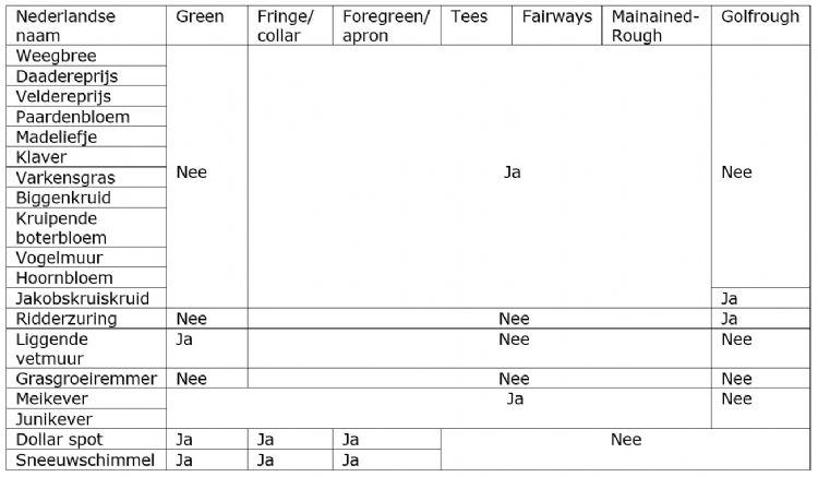Op golfbanen is de situatie iets anders, eveneens samengevat in een overzichtelijk schema bij de genoemde Regeling. Hoewel volgens de schema's in sommige gevallen nog gespoten mag worden, moet dat uiteraard zo veel mogelijk worden beperkt. Daarbij geldt het volgende: - Door goede monitoring moeten problemen al in een vroeg stadium worden voorkomen. - Volgens een advies van deskundigen kan de inzet van gewasbeschermingsmiddelen in een jaar beperkt blijven tot 20 procent van het speeloppervlak. Wanneer op een sportveld meer gebruik nodig blijkt, is dit een duidelijke indicatie dat er iets mis is en dat het onderhoud nadrukkelijk bijgestuurd moet worden.
