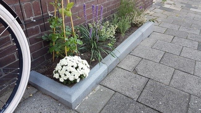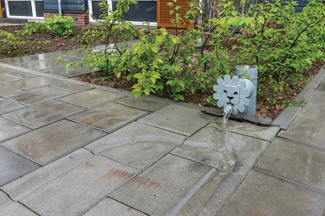Operatie Steenbreek met geveltuinbandenTegels eruit, plantjes erin. Met deze geveltuinband kunnen trottoirs samen met bewoners eenvoudig vergroend worden, dankzij de maatvoering 5/8x25x90 cm. Niet alleen de rechte band, maar ook het hoekstuk is aan de buitenzijde perfect afgestemd op de tegelmaten 20x20 en 30x30 cm. De 25 cm hoogte biedt voldoende ondergrond voor beplanting. In de binnenstad van Dordrecht zijn inmiddels de mooiste geveltuinen te bewonderen. De gemeente is lid van Stichting Steenbreek en geeft hiermee zelf het goede voorbeeld.Hollandse waterwerken in tegelformaatDe Hollandsche waterwerken vormden voor Kathlijn de Booij de inspiratie om watertegels voor het schoolplein te ontwikkelen. Dit ontwerp wordt nu ook gebruikt om hemelwater van het dak via het trottoir naar een wadi of andere infiltratievoorziening te leiden. Een speels ontwerp dat in combinatie met de waterspuwers van BuroJet een wijk een eigen identiteit kan geven en bewustwording over waterafvoer. Bijvoorbeeld voor het Leeuwse Veld in de gemeente West Maas en Waal.