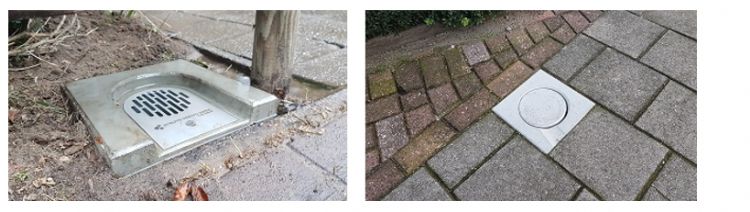 Aansprekende uitstroomtegelsDeze tegels ontworpen door BuroJet zijn bedoeld als overloop van ondergrondse infiltratievoorzieningen die rechtstreeks zijn aangesloten op de regenpijp van woningen. Beide kunnen eenvoudig worden aangesloten op een PVC-buis Ø 125 mm. De Well-O-Well ligt in het trottoir, de Well-O-Edge ligt op de erfgrens tussen twee verhoogde opsluitbanden. Het fraaie RVS-rooster kan gepersonaliseerd worden door uitfrezen en etsen.