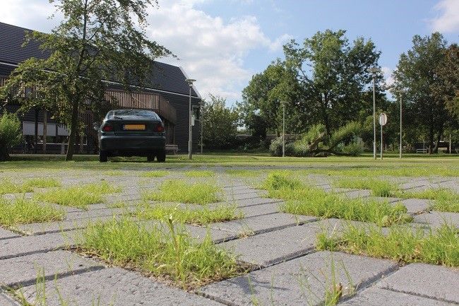 Groene parkeervakken met GreenbrickDe Greenbrick is een holle keiformaat steen van gerecycled kunststof die met teelaarde of bomenzand en graszaad wordt opgevuld. Voor een stabiel legverband zijn de Greenbricks aan de bovenzijde voorzien van speciale verstevigingsribben. De combinatie van Greenbrick grasstenen met gesloten verharding zorgt voor optimale begaanbaarheid met een groene uitstraling. Groen houdt minder warmte vast en verkoelt door verdamping van water. Bovendien kan het bij extreme regenval water laten infiltreren in de bodem. De Greenbrick is zowel los of in een machinaal pakket in keiformaat leverbaar.