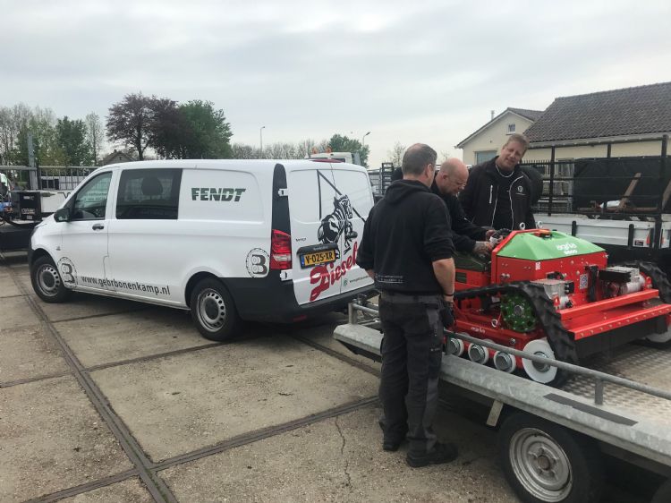 Gebr. Bonenkamp Techniek en Handel vertegenwoordigt het Duitse merk Agria in Nederland. Als redactie spraken we accountmanager Anne Hekman. Vanwege Koningsdag stond de nieuwste Agria 9600 demomachine in de werkplaats. 'Met 653 kg is het een lichtgewicht ontwerp met een laag zwaartepunt. Dat komt mede doordat het maaidek tussen de rupsbanden zit', vertelt hij. 'Deze vernieuwde Agria 9600-112 kun je rustig taluds op sturen met hellingen tot 55 graden, ofwel 143 procent. Zeker als je hem laat uitvoeren met rupsen die zijn voorzien van een trekkerbandprofiel.' Van de Agria 9600 zijn twee versies beschikbaar: met een werkbreedte van 112 en 80 cm. Afhankelijk van de ingestelde maaihoogte is de machine 72 tot 85,5 cm hoog. Doordat dit vrij laag is, kun je er gemakkelijk mee manoeuvreren onder zonnepanelen. Daarbij blijft de machine tot een afstand van 300 m reageren op de afstandsbediening.