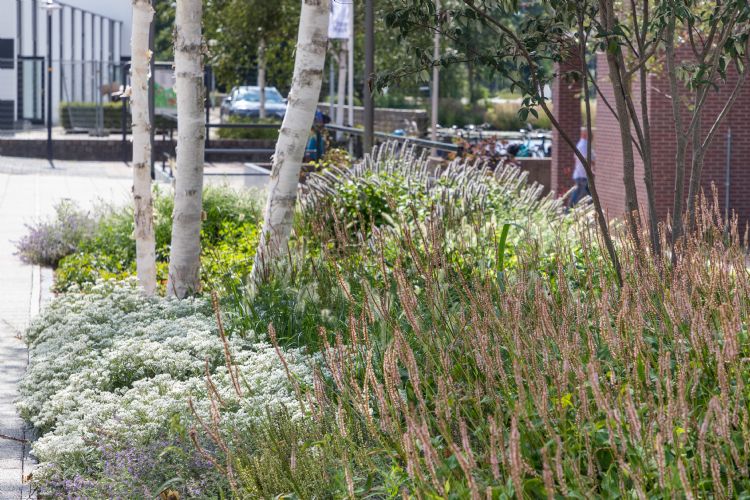Kies je voor vaste planten of voor bomen en solitairheesters? Dat is een keuze die helemaal niet gemaakt hoeft te worden, vinden ze bij vasteplantenkweker Griffioen Wassenaar in Boskoop/Wassenaar, de concepteigenaar van GreentoColour. Liever niet, zelfs. De combinatie zorgt namelijk jaarrond voor een spectaculair effect. Daarbij is de positieve invloed op de functionele biodiversiteit groot. Aan een succesvolle toepassing met een lange levensduur zitten wel enkele voorwaarden. Michelle de Roo, ontwerper bij Griffioen, licht ze toe.