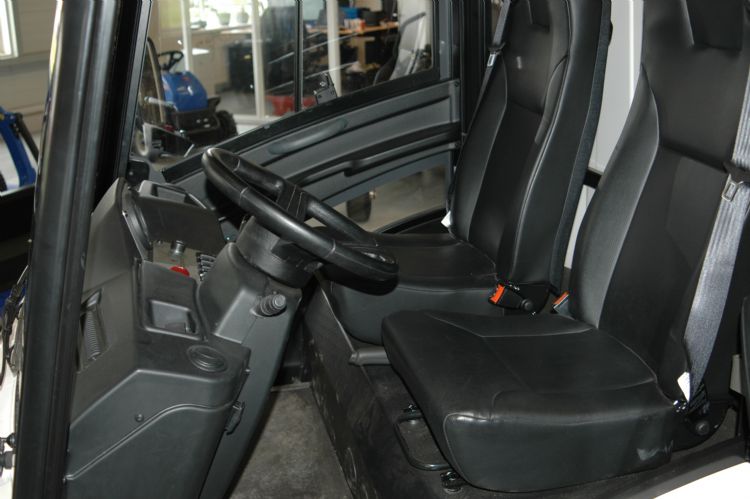 Maar ook het dubbelcircuit-remsysteem en de lastafhankelijke remkrachtverdeling maken het voertuig extra veilig. De 139 cm brede en 200 cm hoge standaardcabine beschikt over voorruitverwarming en heeft een ruime instap. De twee zijdeuren openen aan de voorkant. Deze werkomgeving voor twee man biedt een goed zicht en comfortabele zitplaats, ook voor langere en zwaardere medewerkers. Deurvergrendeling bij snelheden hoger dan 4 km/u is standaard. Het dashboard oogt eenvoudig, waarbij een display informatie geeft over essentiële zaken. Pennings: 'Dit is de standaarduitvoering van de cabine. Maar er zijn diverse opties, zoals stuurbekrachtiging, verwarming, radio met bluetooth en een geïntegreerde achteruitrijcamera. Naast de witte standaardkleur kun je voor enkele honderden euro's méér je cabine in een RAL-kleur laten spuiten.'