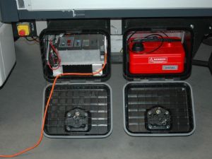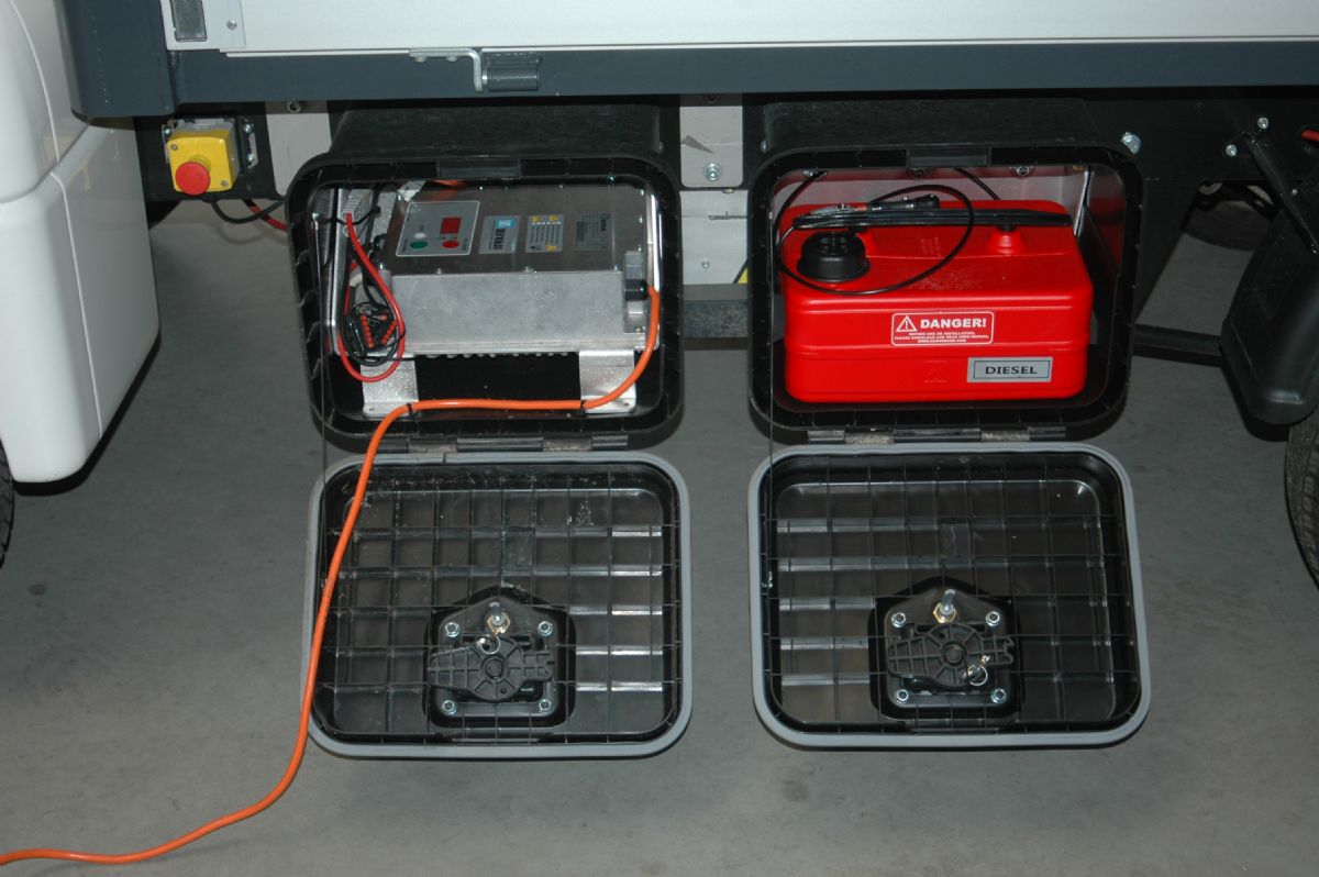 Twee chassisboxen met daarin het laadsysteem en de brandstoftank voor de Webasto-standkachel