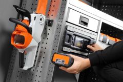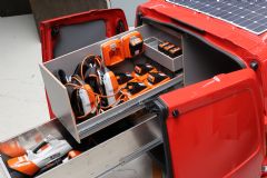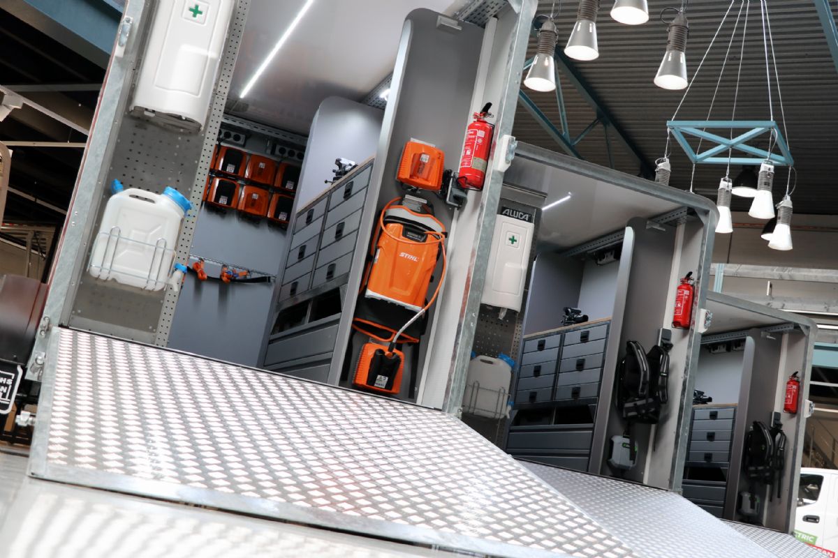 De Zeliox voedt diverse stopcontacten in de laadruimte die bestemd zijn voor andere elektrische apparaten. Voor het accuhandgereedschap is er plaats in de lange schuifladen van de onderkast die op laadvloer staat. Hierin ligt Stihl-materiaal voor elektrisch snoeien, bosmaaien en zagen. Daarbij kun je het zo opbergen dat je in een oogopslag ziet of alle machines aanwezig zijn. Onder de verhoogde laadvloer zitten twee ruimtes die doorlopen tot onder de cabine. Hierin kun je langer gereedschap als harken, schoffels en mogelijk zelfs ladders opbergen. De werkbus is minder hoog dan de ingerichte aanhangers. Mede door de verhoogde laadvloer kun je hier niet rechtop in staan. 'Vandaar de keuze voor deze lange, stevige schuifladen', aldus de woordvoerder van Brover. 'Je hoeft dus niet in de werkbus te klauteren om er gereedschap of accu's uit te halen. In de ingerichte aanhangers zit een kleine werkbank met onder andere een bankschroef. Die is in deze uitvoering weggelaten, maar naast de kasten is er nog steeds ruimte om bijvoorbeeld een kruiwagen te stallen.'